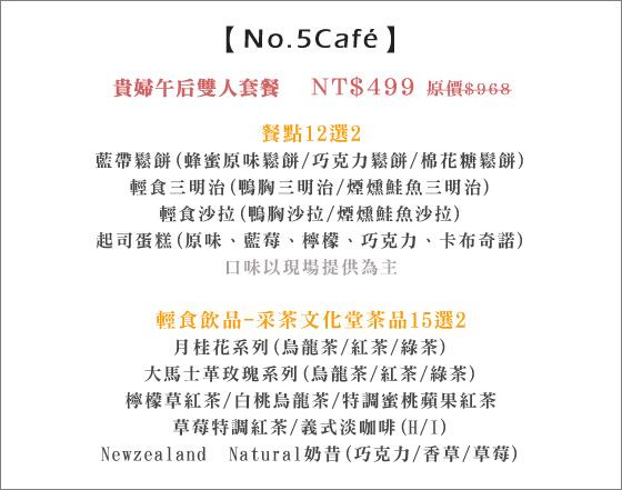 商品訊息簡述: 只要499元(雙人價)即可享有【No.5Cafe】原價968元貴婦午后雙人套餐:藍帶鬆餅(蜂蜜原味/巧克力/棉花糖)/輕食三明治(鴨胸/煙燻鮭魚)/輕食沙拉(鴨胸/煙燻鮭魚)/起司蛋?餐點12選2)+月桂花系列(烏龍茶/紅茶/綠茶)/大馬士革玫瑰系列(烏龍茶/紅茶/綠茶)/檸檬草紅茶/白桃烏龍茶/特調蜜桃蘋果紅茶/草莓特調紅茶/義式淡咖啡(H/I)/newzealandnatural奶昔(輕食飲品15選2)。
